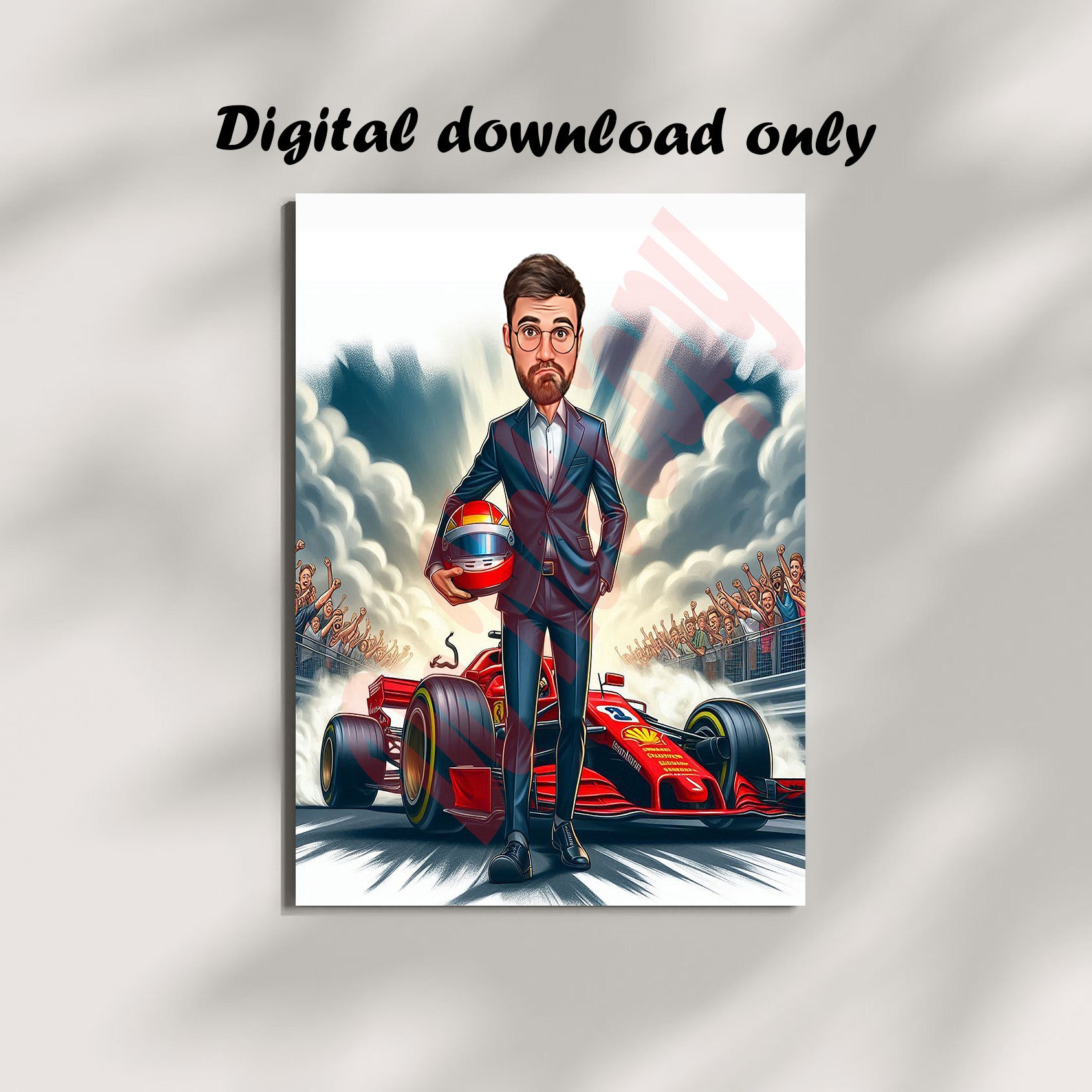 Custom F1 Racing Caricature Portrait, Formula 1 Caricature Drawing from Photo, Unique Gift for Race Lovers, Personalized Unique Caricature Art